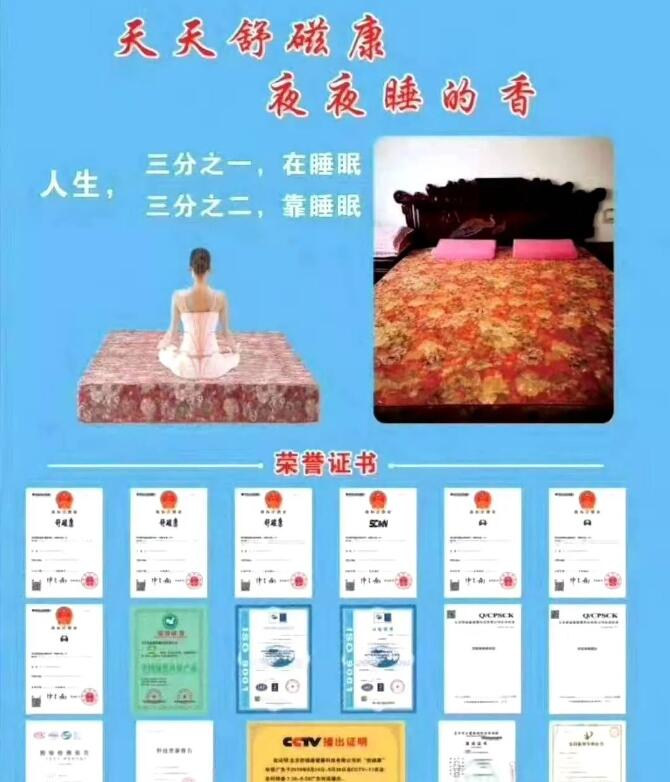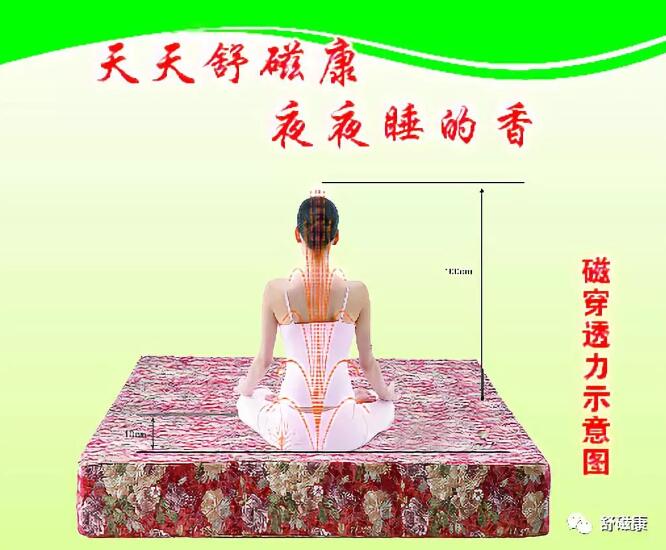 它的面料考究,提花刺繡,上面有舒磁康標(biāo)識。就象我們穿的毛衣,如果是化纖的,在脫的時候,是不是會有靜電,靜電偷走了我們的負(fù)電荷,使紅細(xì)胞聚集,對我們的健康危害很大。而舒磁康地磁床墊,一是防靜電,再一個圖案非常漂亮,所有人都喜歡牡丹花,它的立體感和層次感都非常強(qiáng)。有直觀的防偽作用。